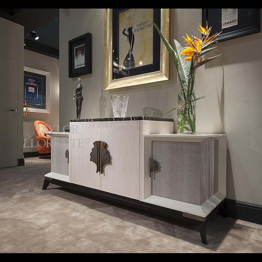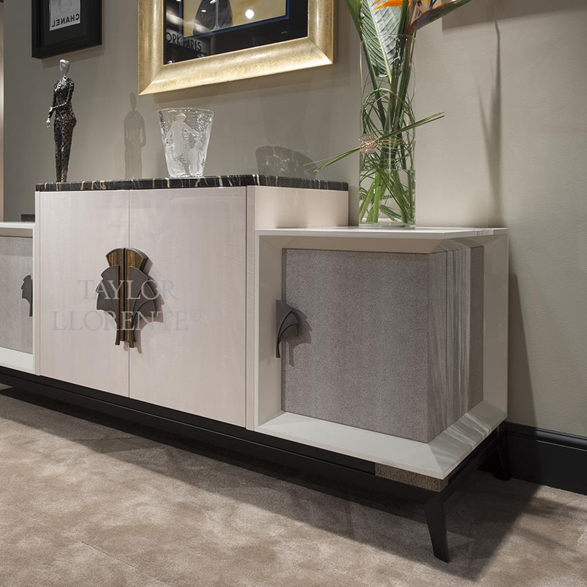 Highly stylised contemporary luxury design Art Deco style sideboard. Raised on a black lacquered base with angled feet. Characterised by the use of high profile and highly specified materials and skilful craftmanship.