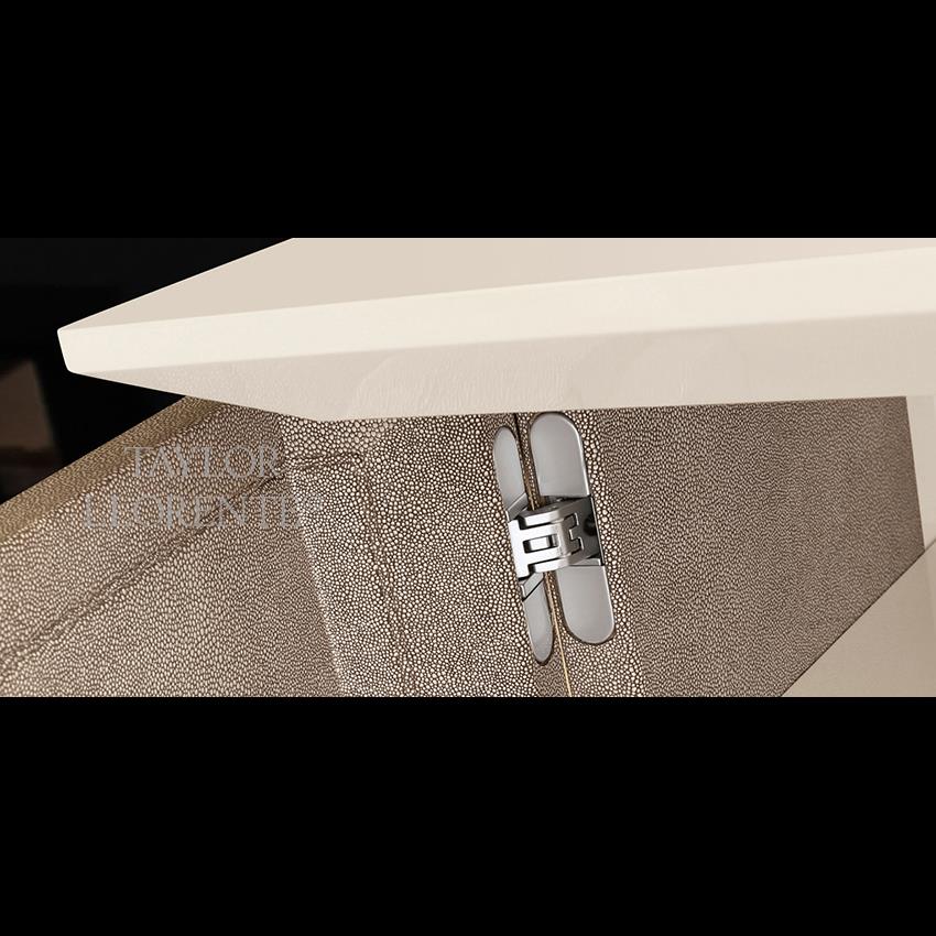 The side doors upholstered in Galuchat design first grade Italian leather (other leathers from the collection available on request). Two central doors to this sideboard and frame in ‘anigre’ wood. Sideboard top centre in distinct Port Laurent marble top. Other finish options and colour combinations on request.