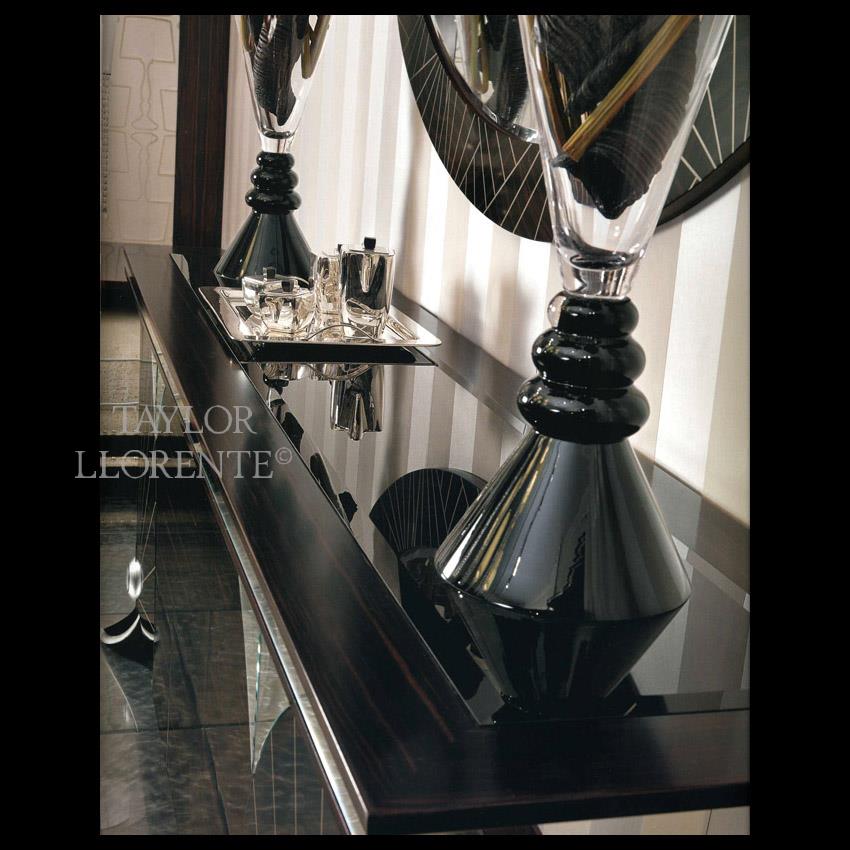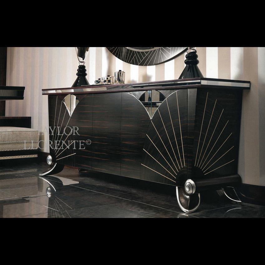 Sideboard top with black glass insert. The use of sumptuous materials in the Art Deco style and the highly decorative design ethos of this sideboard/credenza in keeping with the general principles of luxurious Deco period furniture.