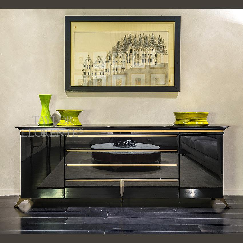 A high end black lacquered sideboard with luxury brass drawers and doors detailing. Our customers can choose any lacquer colours of the collection on request.