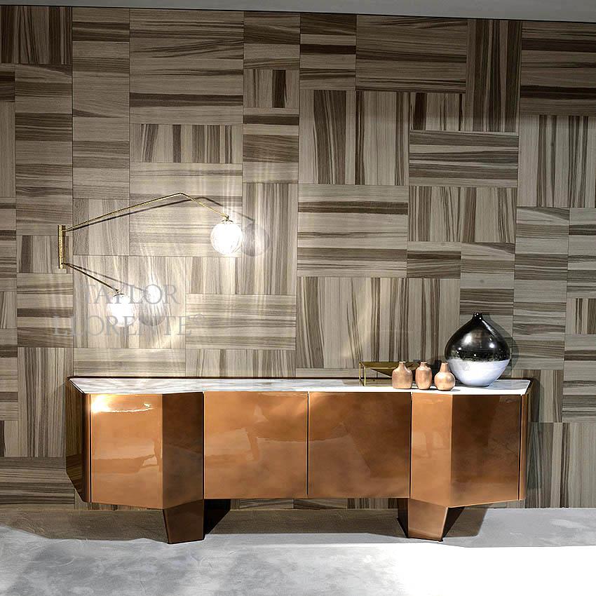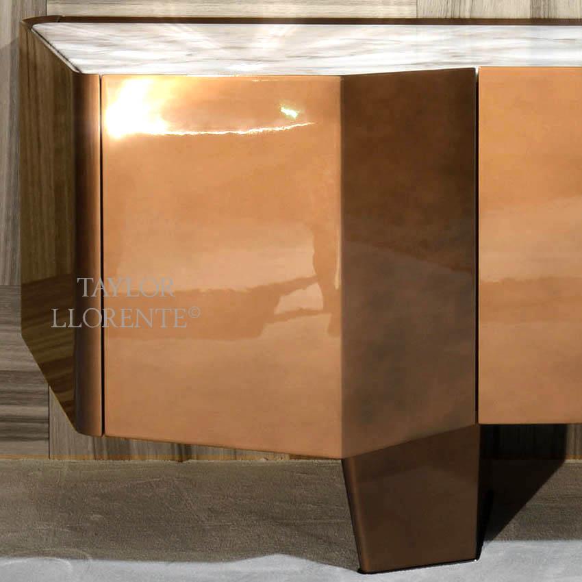 Luxury architectural CUBIST design metallic bronze sideboard/credenza with modern geometric shape and marble sideboard top.