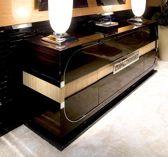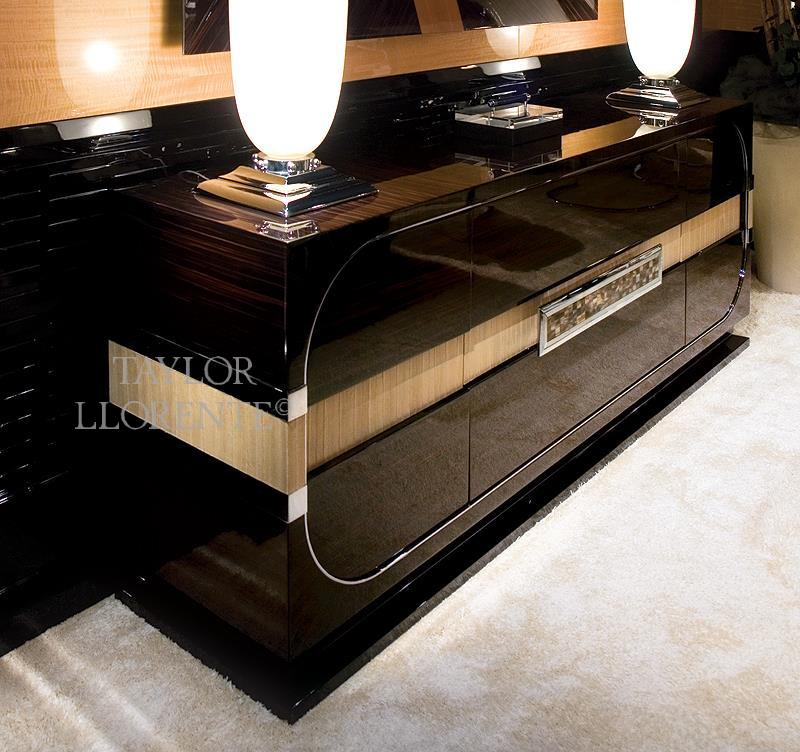 Main frame of sideboard in high gloss macassar ebony with deco streamline elliptical inner design detailed with polished steel line.