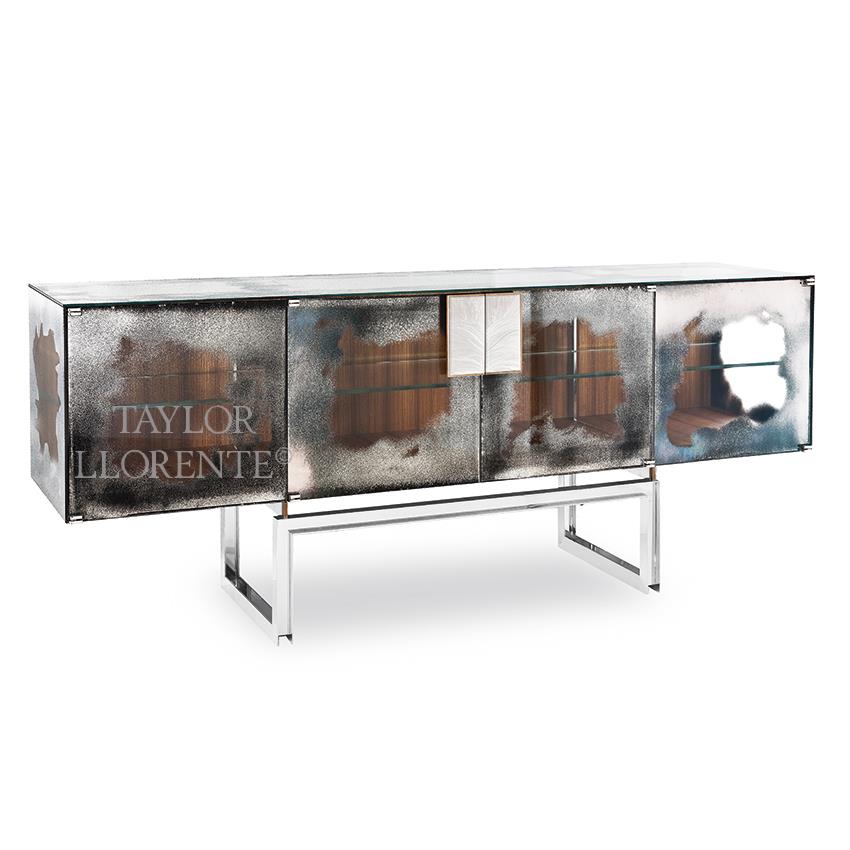 Designer architectural sideboard made in hand finished Venetian Italian glass with antique glass finish.