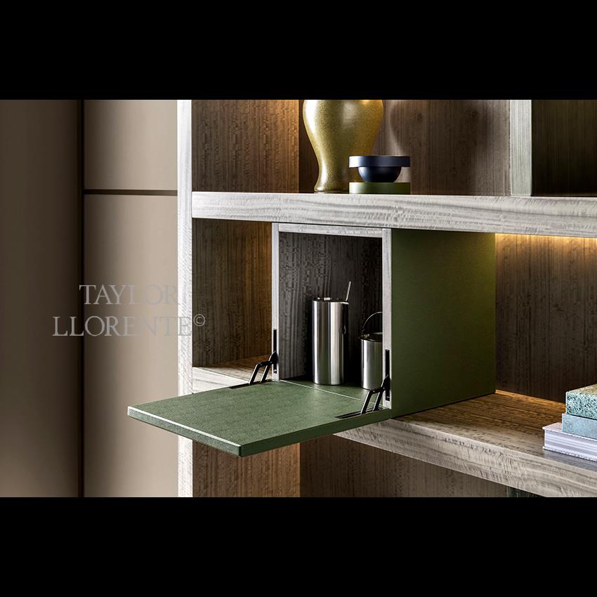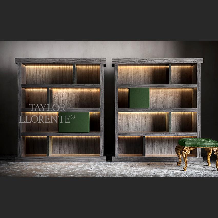 Grand, contemporary and bold display bookcase created as pictured with eucalyptus wood structure. Partitions 1 in metallic finish bronze or pewter and 2 partitions in marble. Marble options on request. And 1 storage element with drop down opening (pictured in green leather). Leather colours on request.