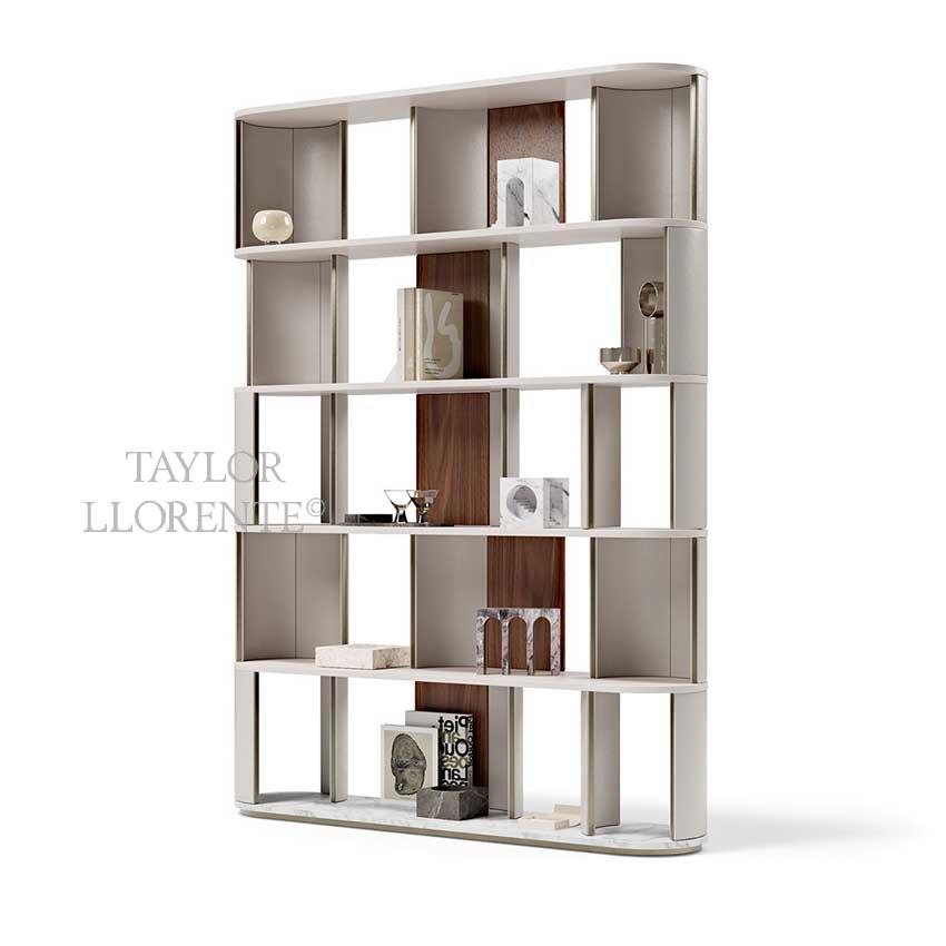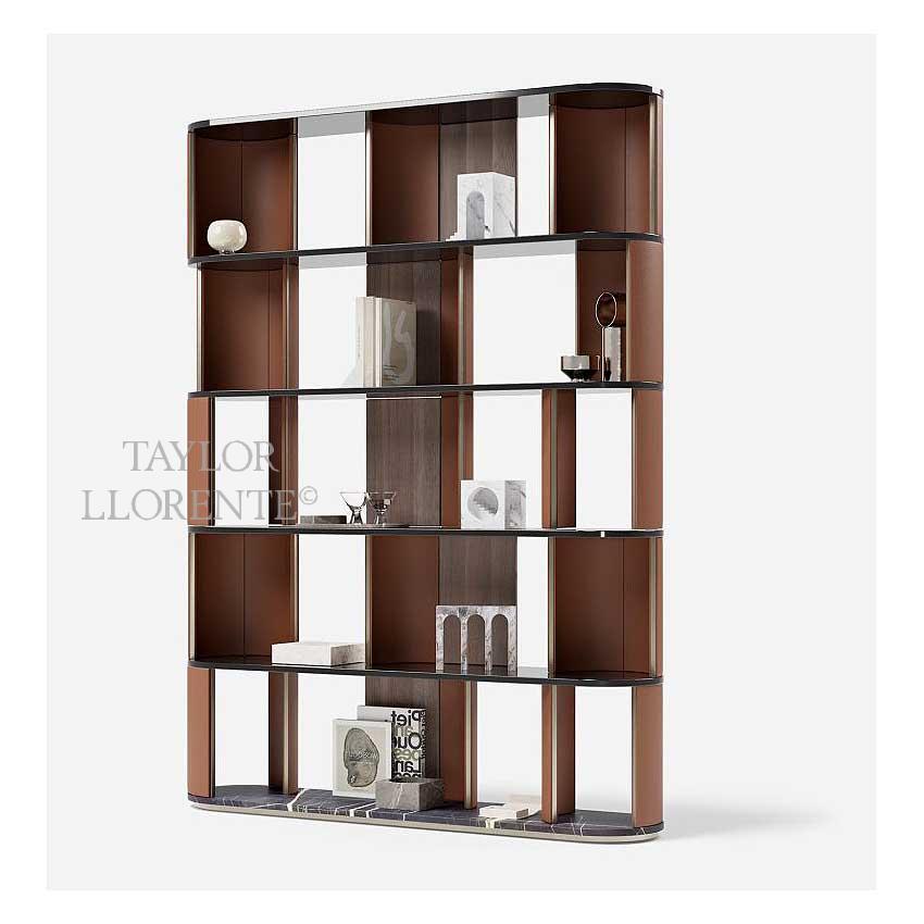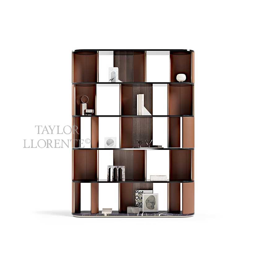 Modern architectural display bookcase created with luxury leather, wood, metal and marble.
