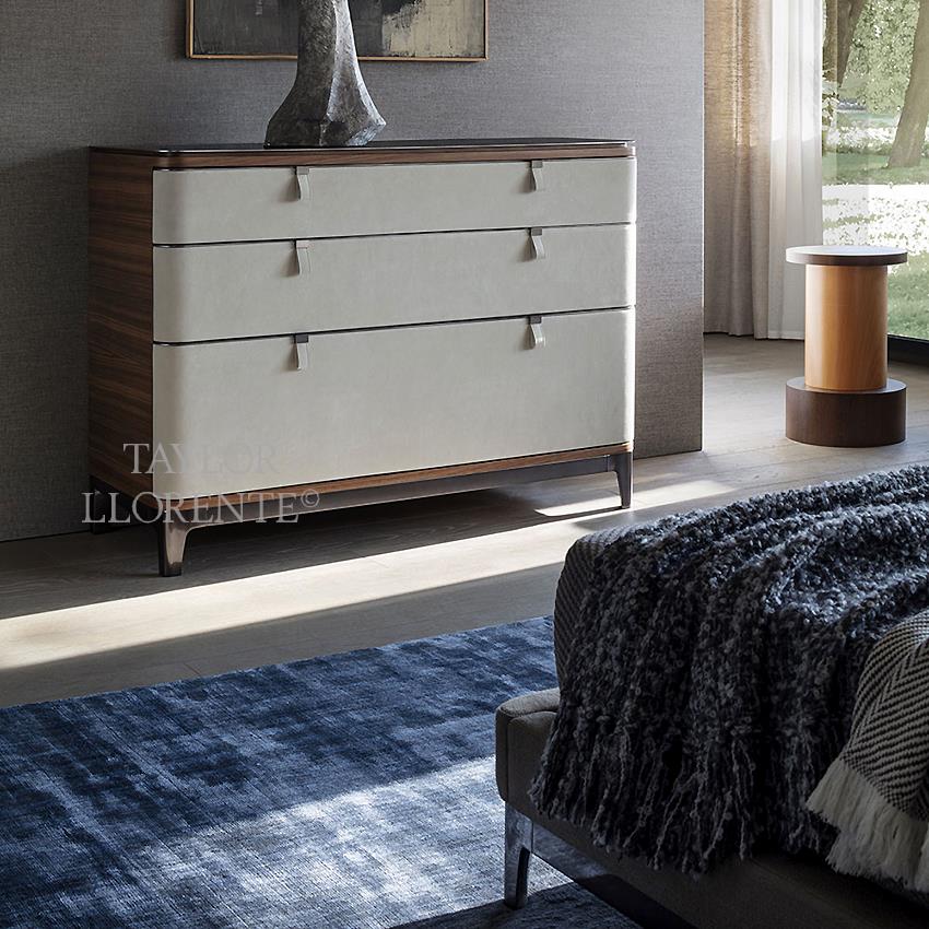 Luxury chest of drawers with architectural lines created in high specification Italian leather and walnut wood.