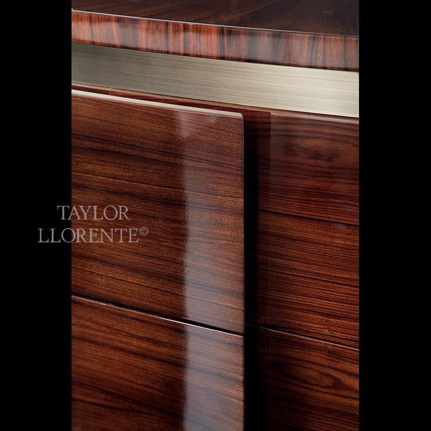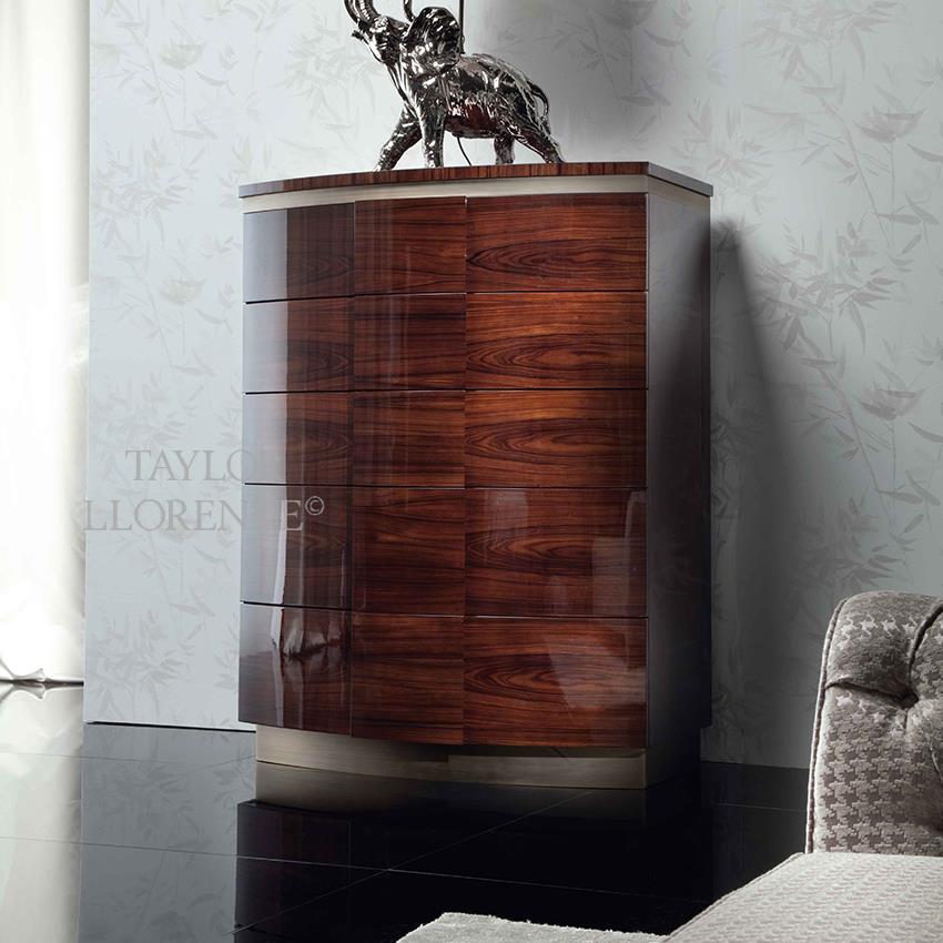 Luxury chest of 5 double drawers, full extension drawers created in highly figured rosewood with high gloss protective finish. Interior of drawers bottoms inlaid with velvet.